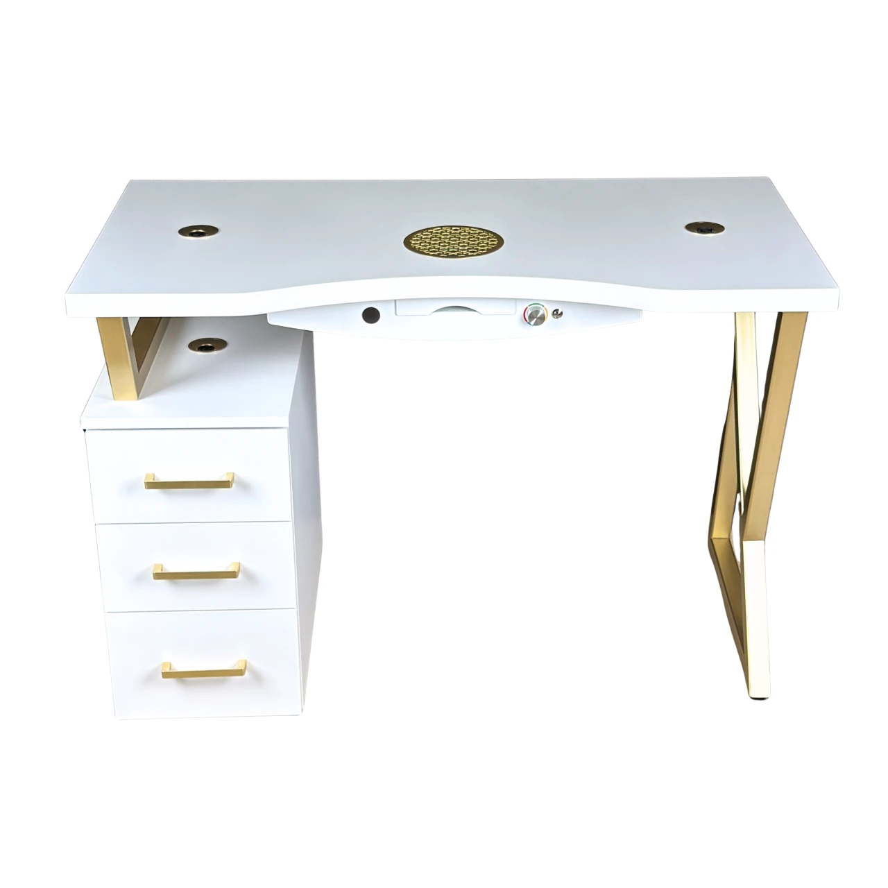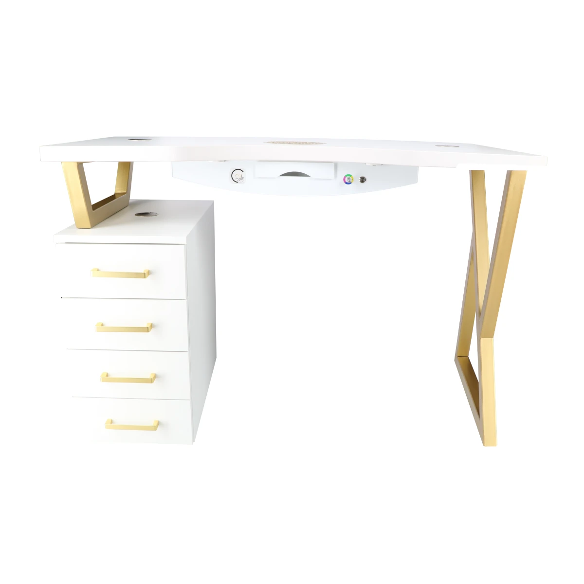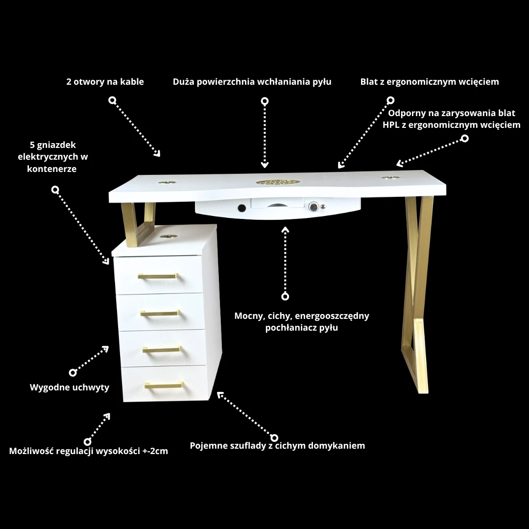 Biurko do manicure COLORS GOLD to stylowe połączenie złotych elementów nośnych o wyjątkowym kształcie z funkcjonalnością profesjonalnego stanowiska pracy.