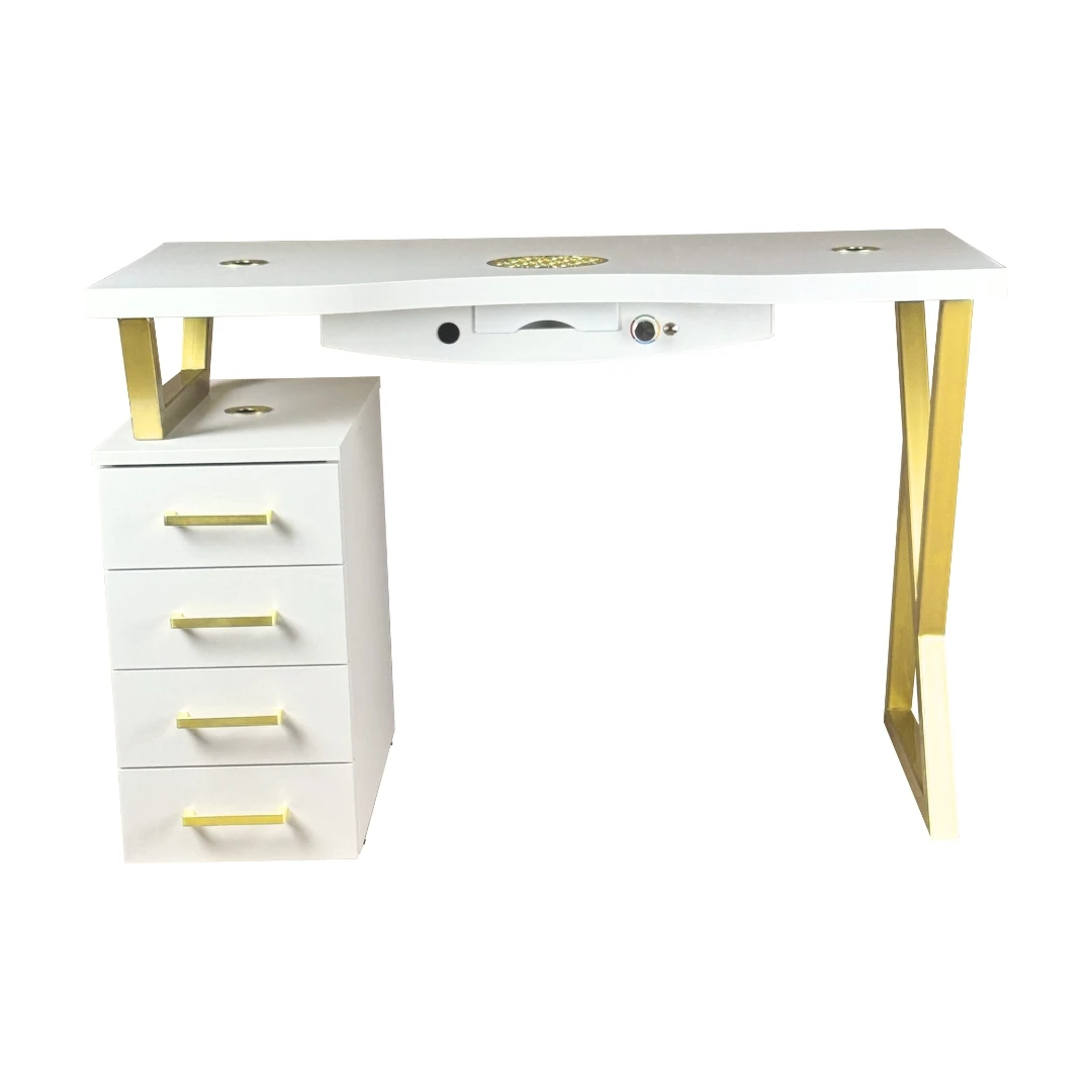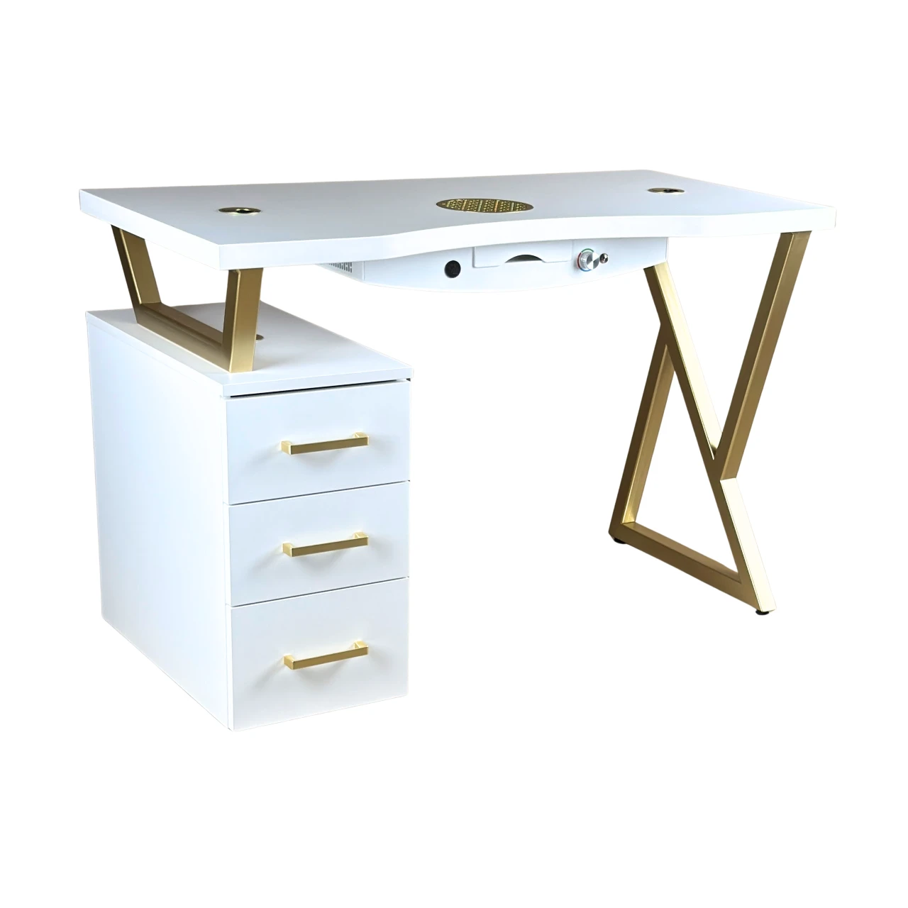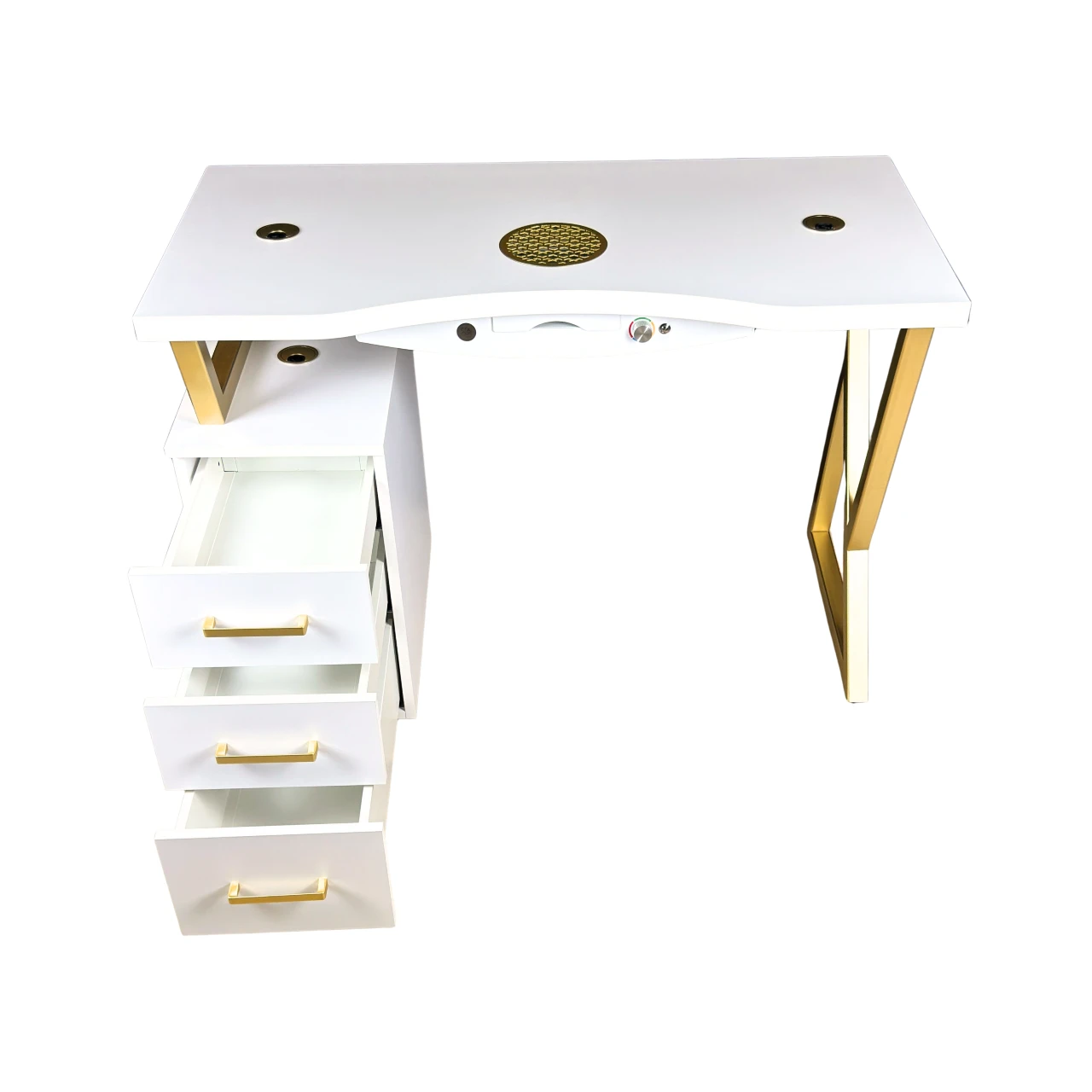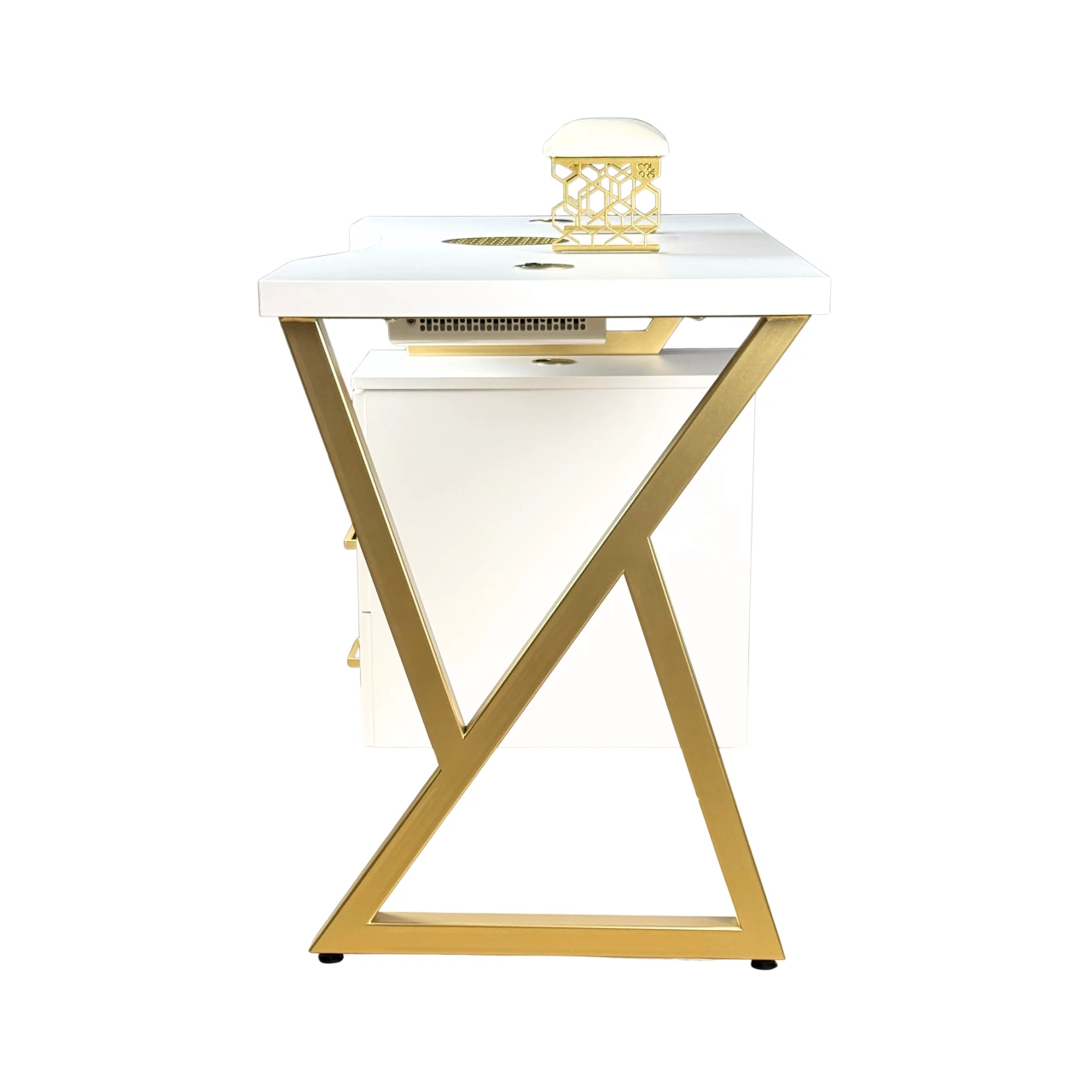 Biurko do manicure COLORS GOLD to stylowe połączenie złotych elementów nośnych o wyjątkowym kształcie z funkcjonalnością profesjonalnego stanowiska pracy.