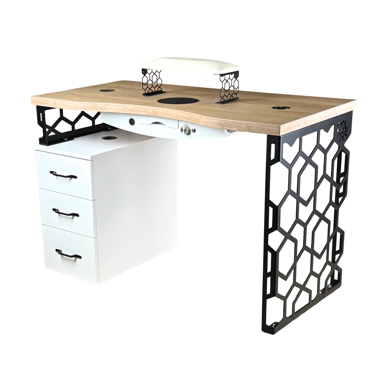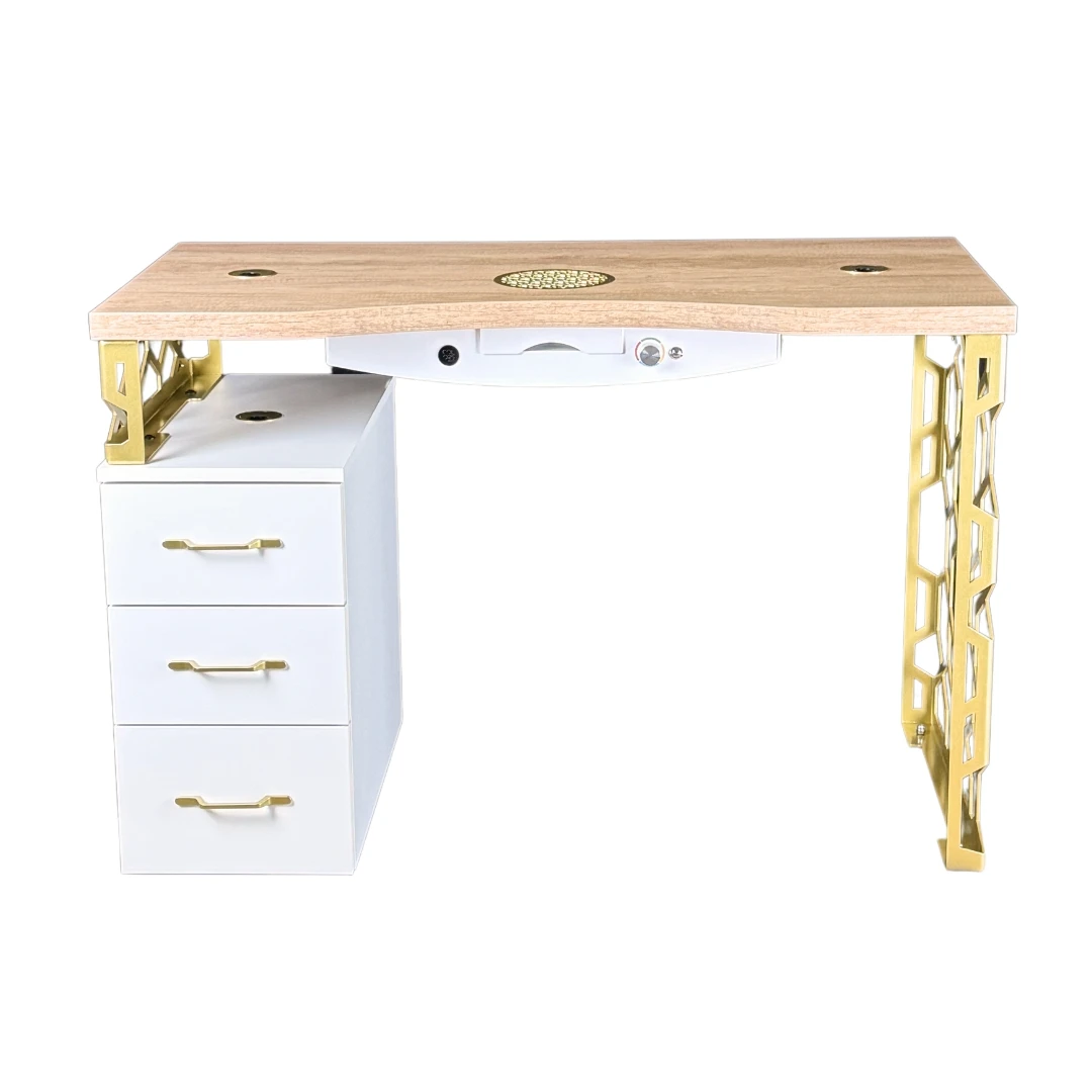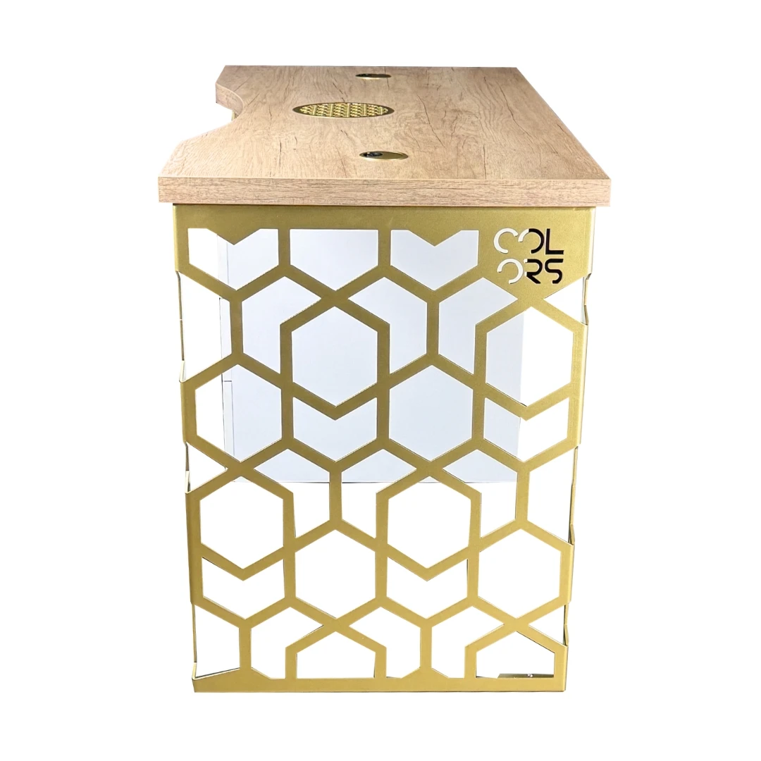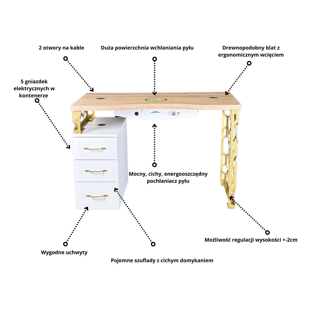 Biurko do salonu kosmetycznego z drewnianym blatem i pochłaniaczem pyłu jest skonstruowane z najwyższej jakości materiałów. Noga biurka jest wykonana ze stali, pomalowana na kolor złoty, a kształt, to kompozycja nieregularnych hexagonów, które nadają biurku kosmetycznemu lekkości i wyjątkowego designu . Podpora nad kontenerem stanowi kontynuację wzoru nogi, przez co design jest spójny i nowoczesny. Całość dopełniają wygodne w użytkowaniu uchwyty w kolorze złotym spójne z kolorystyką podpór, przelotów na kable oraz kratki.