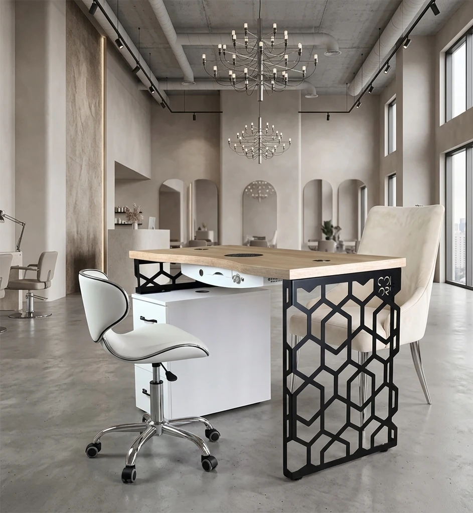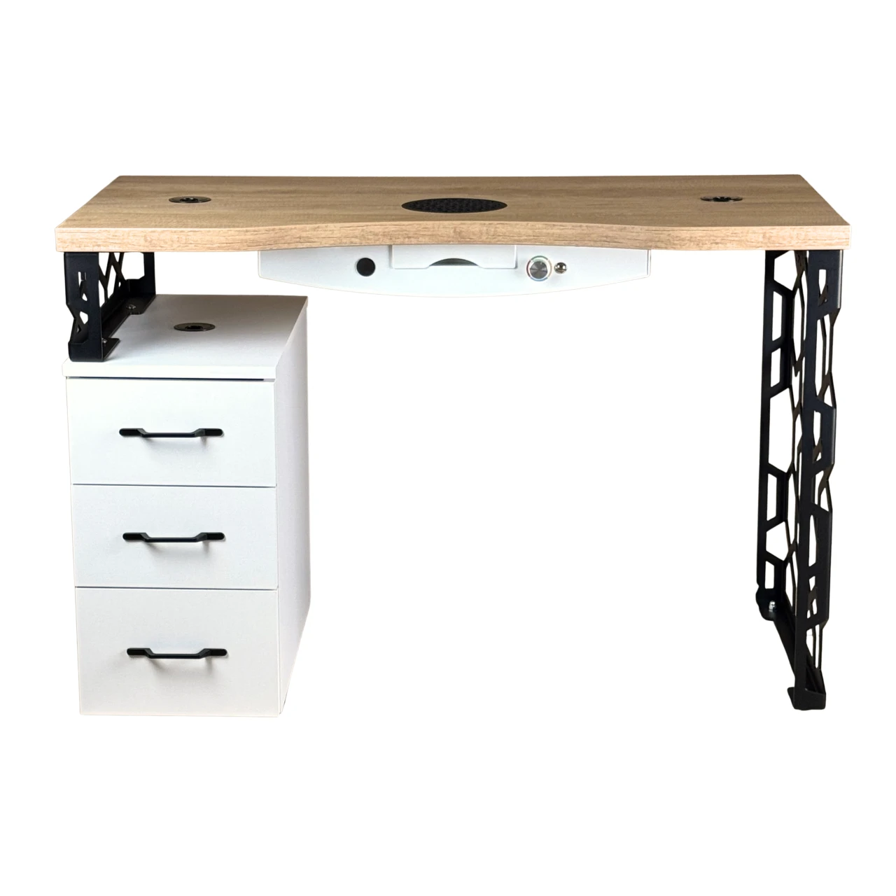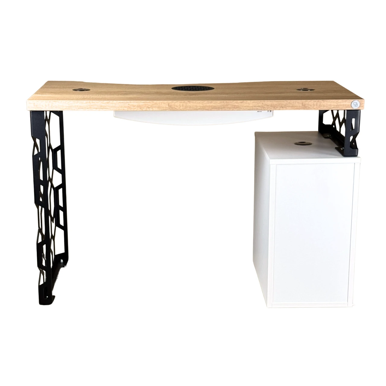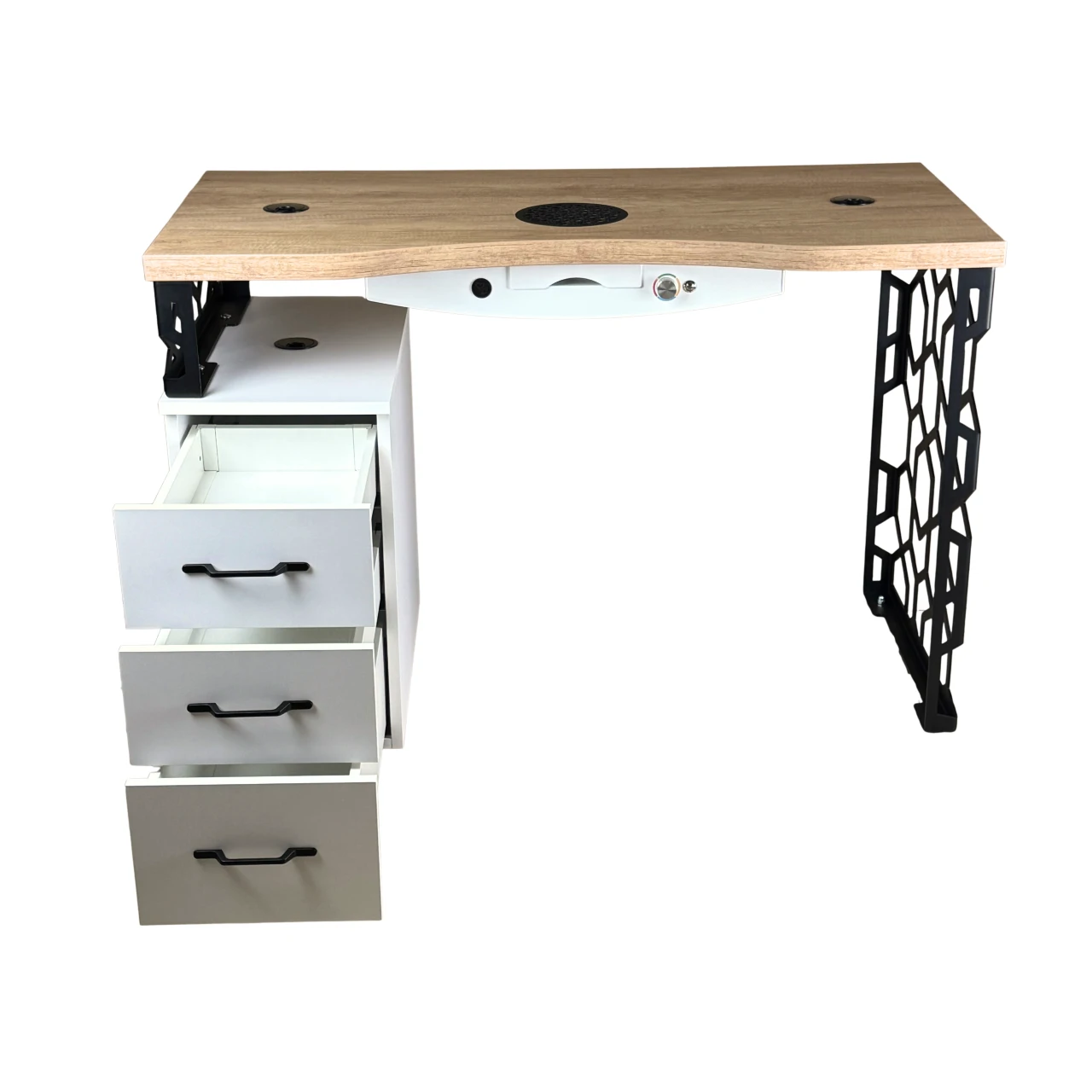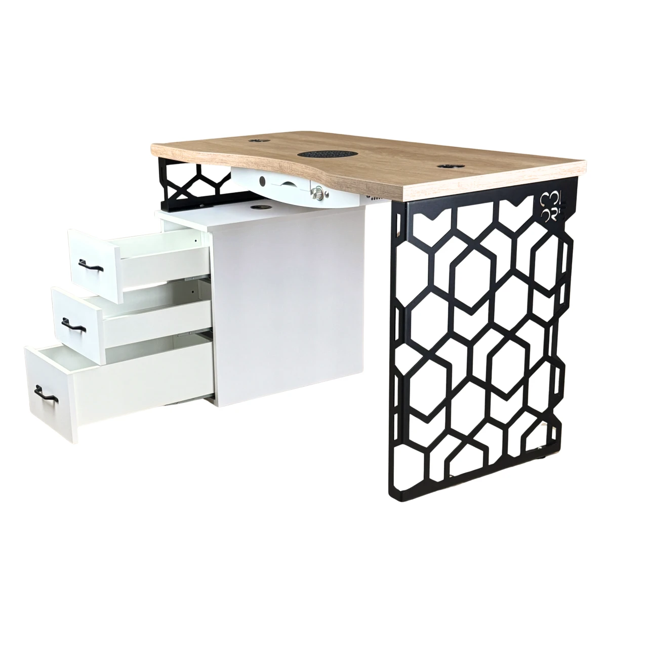 Biurko do salonu kosmetycznego z drewnianym blatem i pochłaniaczem pyłu jest skonstruowane z najwyższej jakości materiałów. Noga biurka jest wykonana ze stali, pomalowana na kolor złoty, a kształt, to kompozycja nieregularnych hexagonów, które nadają biurku kosmetycznemu lekkości i wyjątkowego designu . Podpora nad kontenerem stanowi kontynuację wzoru nogi, przez co design jest spójny i nowoczesny. Całość dopełniają wygodne w użytkowaniu uchwyty w kolorze złotym spójne z kolorystyką podpór, przelotów na kable oraz kratki.