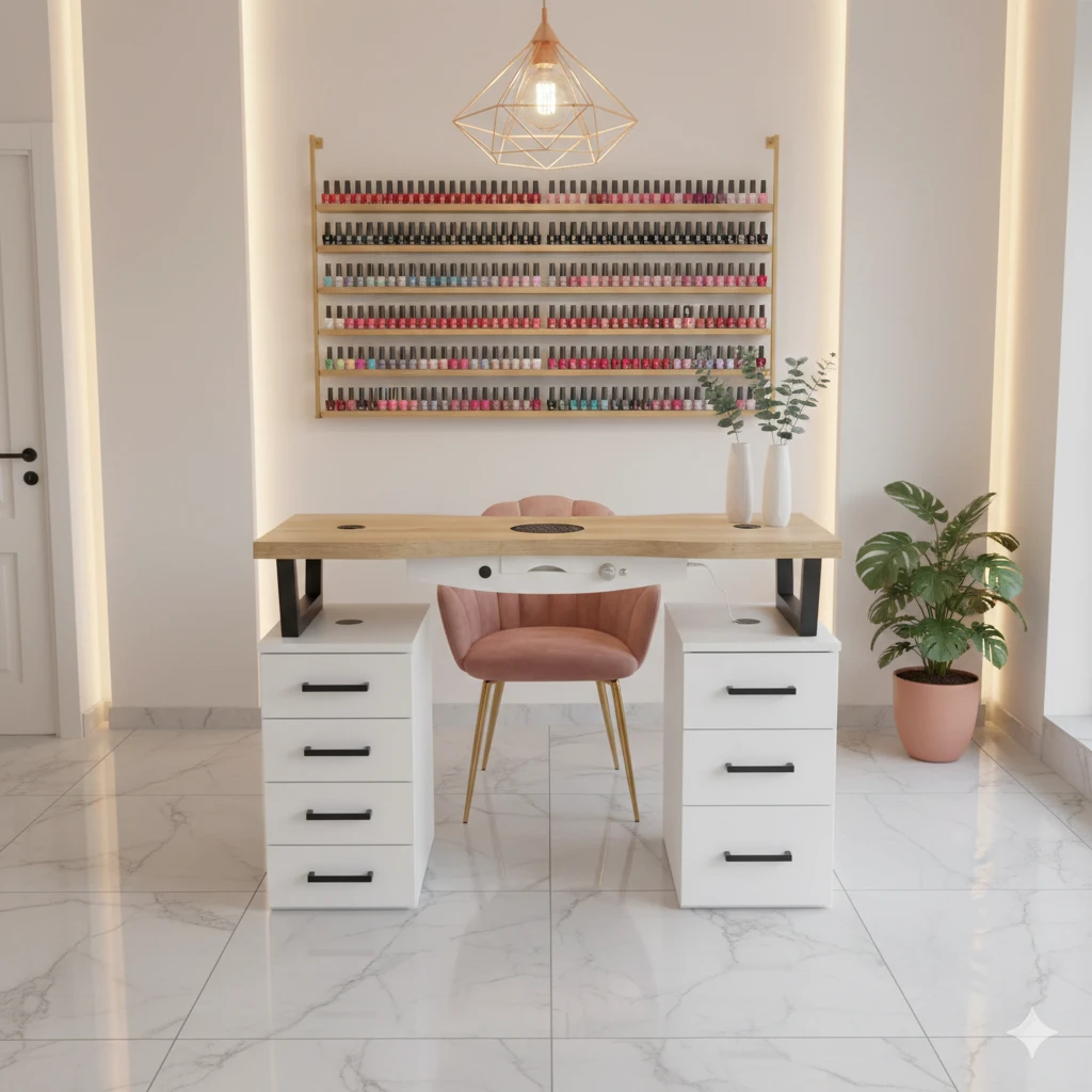 Biurko kosmetyczne z szufladami i drewnianym blatem COLORS GLAMOUR WOOD łączące stylową estetykę z materiałami najwyższej jakości, zostało zaprojektowane tak, aby zapewnić stylistce paznokci maksymalny komfort pracy.